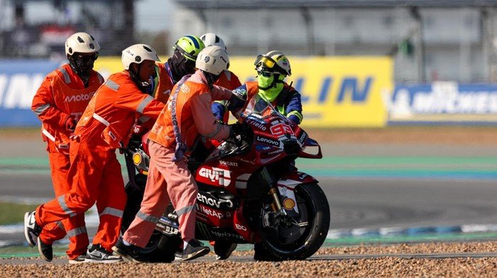 Ducati MotoGP Team Manager, Davide Tardozzi, menjelaskan penyebab motor Marc Marquez mengalami pecah velg di MotoGP Thailand 2026, Minggu (1/3/2026). Kata Tardozzi, insiden itu disebabkan karena roda belakang motor Marquez menghantam bagian kerb.